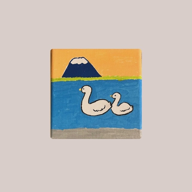 富士山、湖、白鳥の親子を描きました。 サイズ:キャンバス10㎝×10㎝ 画材:アクリルペン ※直射日光を避けてお飾りください。